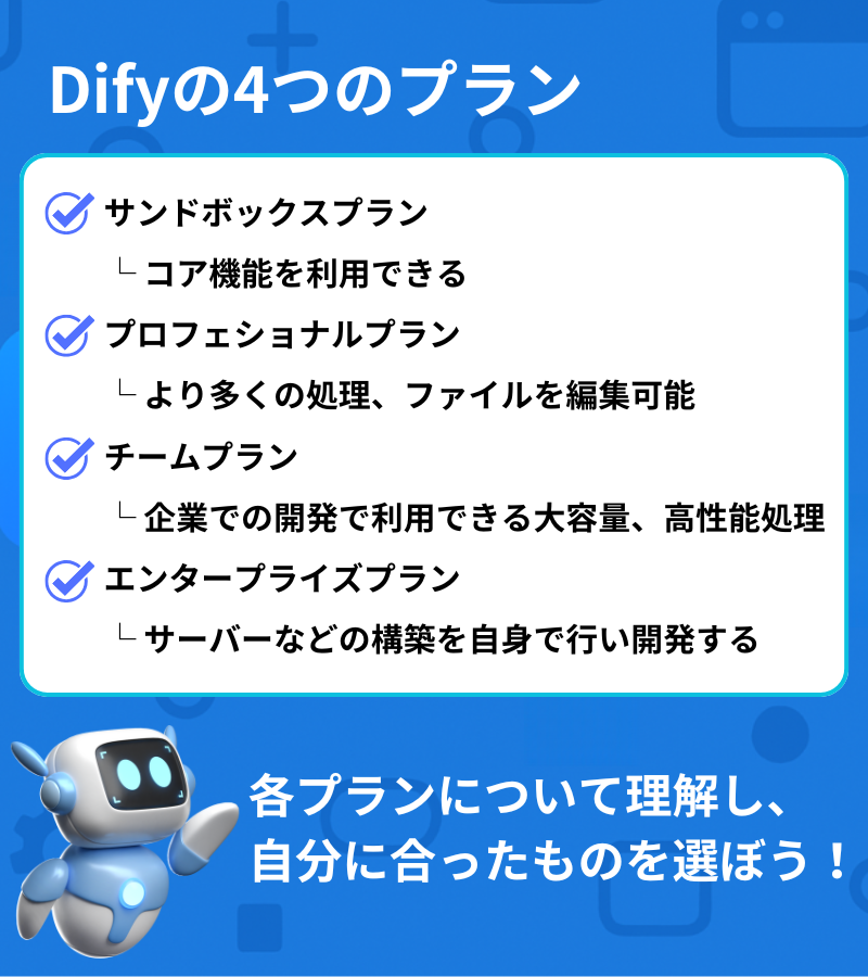 Difyを使いたいと考えている方で、どのプランにしようか悩んでいる方もいるのではないでしょうか?