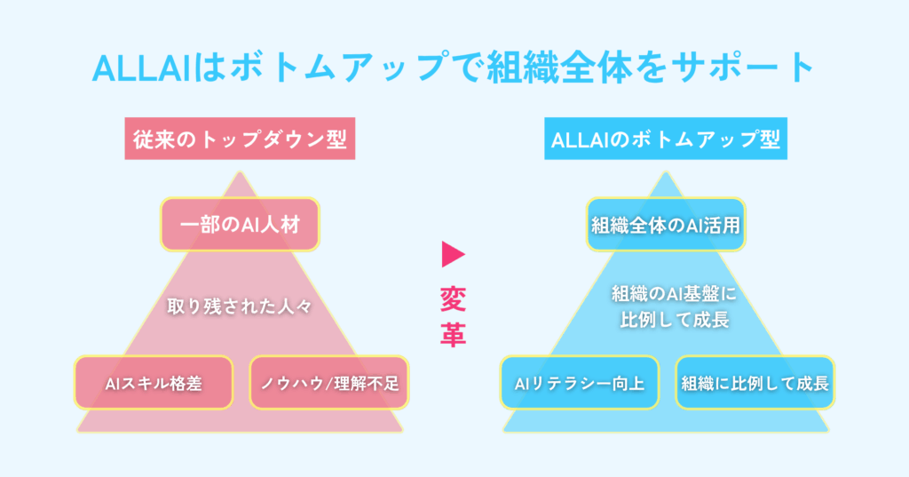 ALLAIはトップダウンのAIスキルよりも、ボトムアップである組織全体のAIリテラシーの底上げを