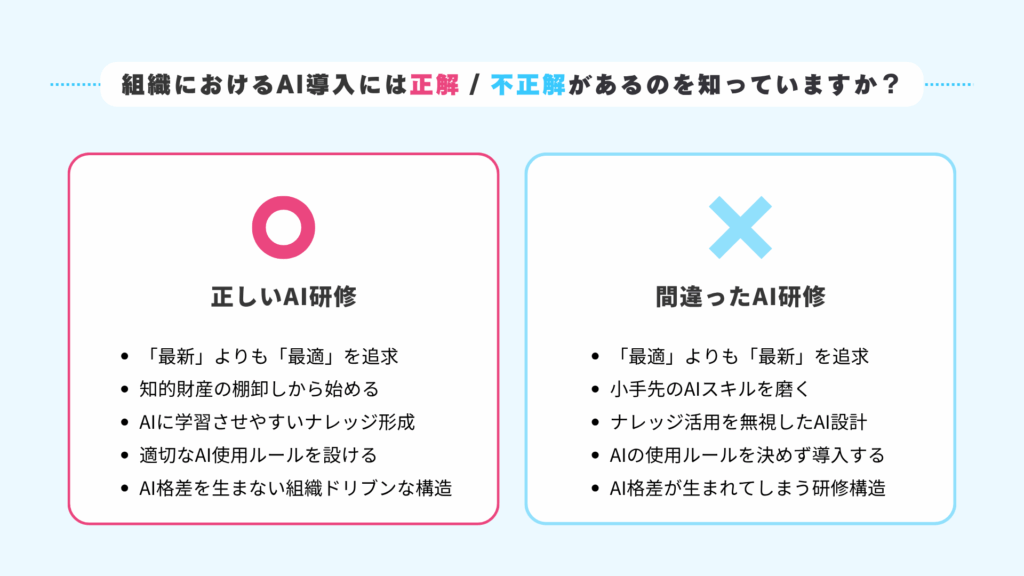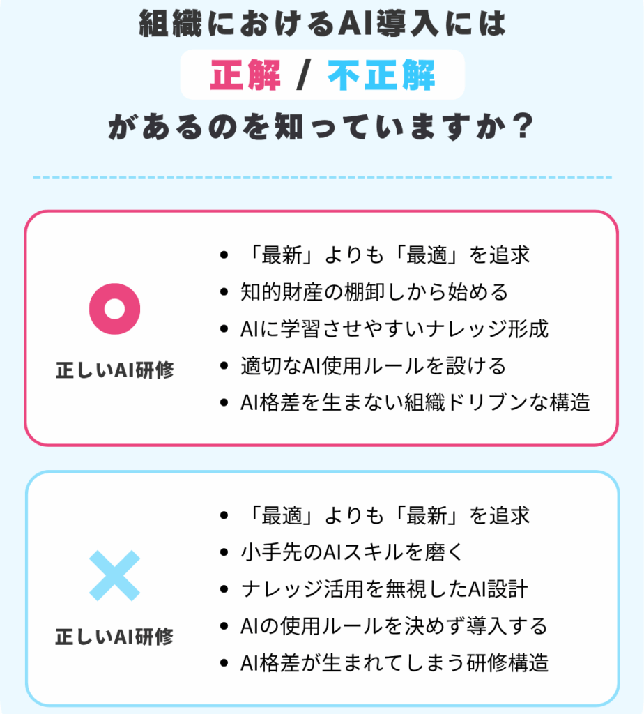 経営層や社員と一緒に取り組むことで、組織に根付くAIスキルと屈強なナレッジ基盤を生み出します。