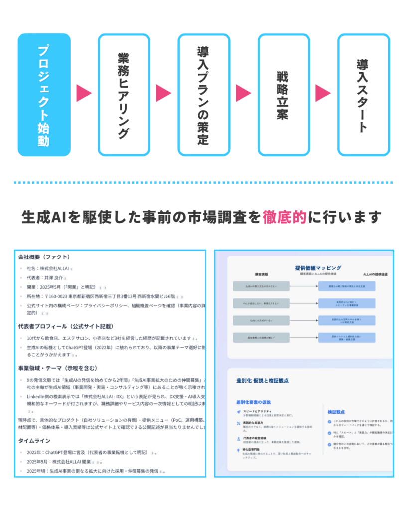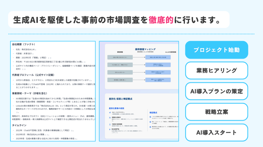 生成AIを活用した徹底的な事前市場調査を実施いたします。