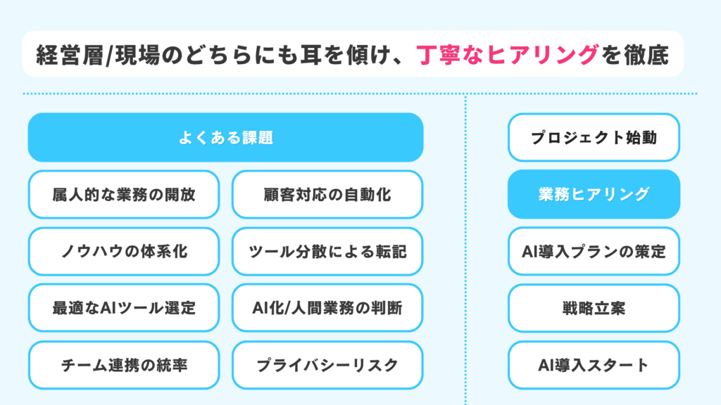 経営層と現場の双方に丁寧なヒアリングを行い、
