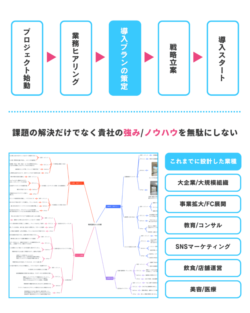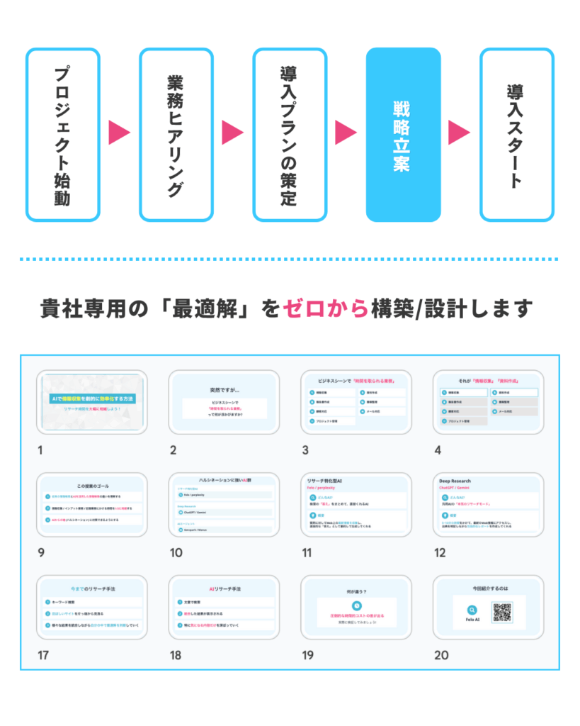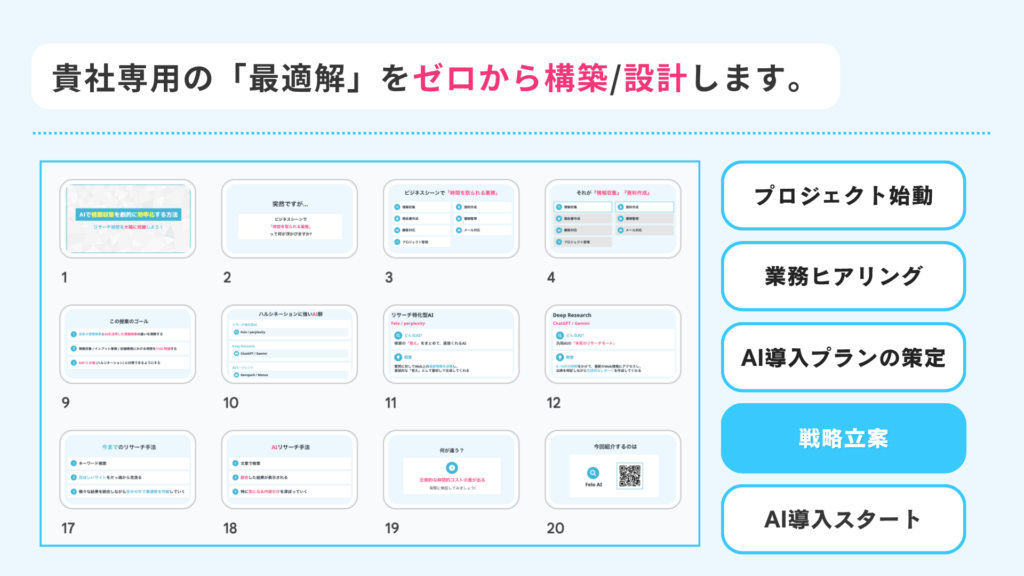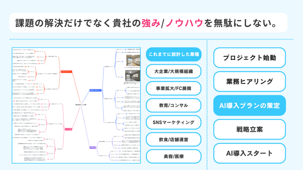 ヒアリング内容をもとに、貴社専用のAI導入プランをゼロから設計いたします。