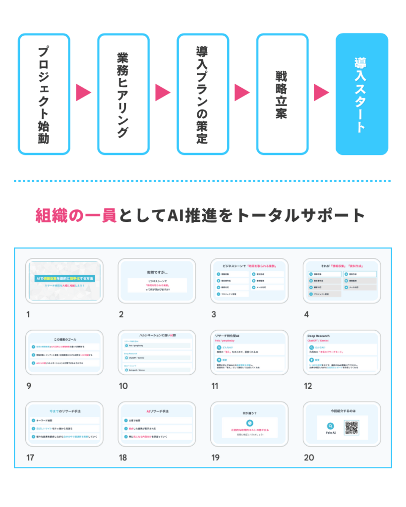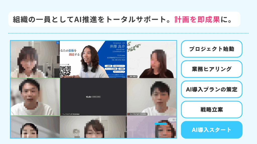 複数のワークショップを通じて、具体的なAI導入戦略を貴社と共に構築します。