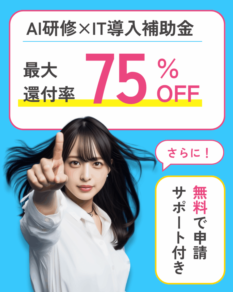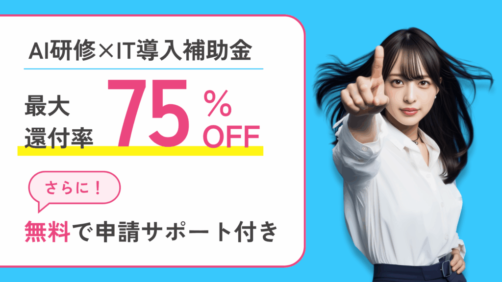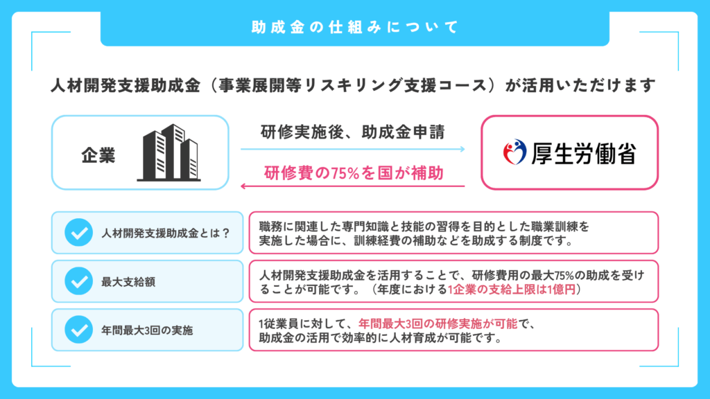 研修費用の最大75%(大企業は60%)が国から補助される「人材開発支援助成金」の活用をサポート。高額な研修コストの壁を取り払い、全社的なスキルアップへの投資を容易にします。