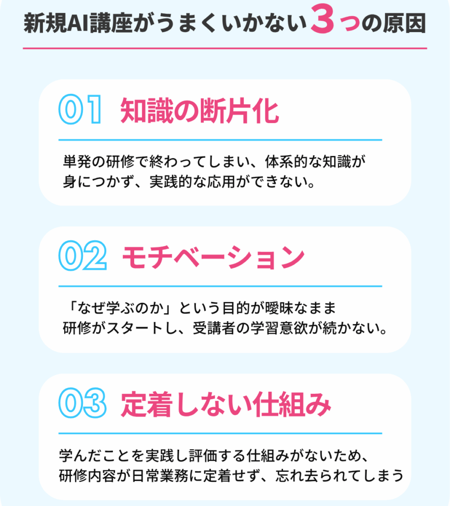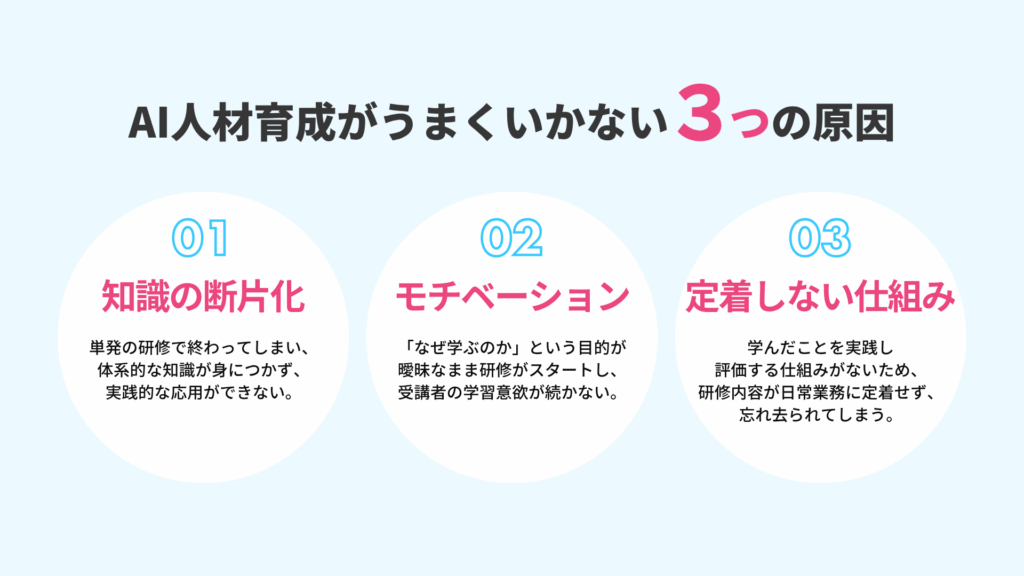 しかし、多くの企業が「何から始めるべきか」「研修をやっても現場で使われない」という壁に直面しています。