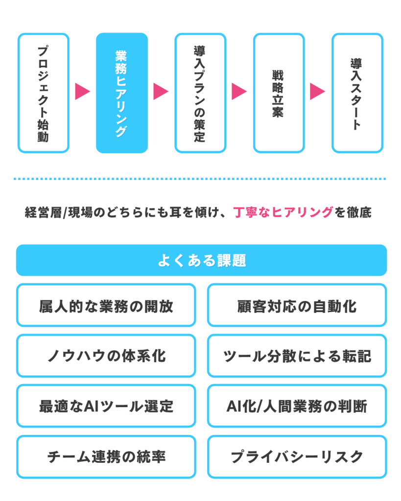 経営層と現場の双方に丁寧なヒアリングを行い、属人的な業務、ノウハウの散在、ツール分散による非効率など、