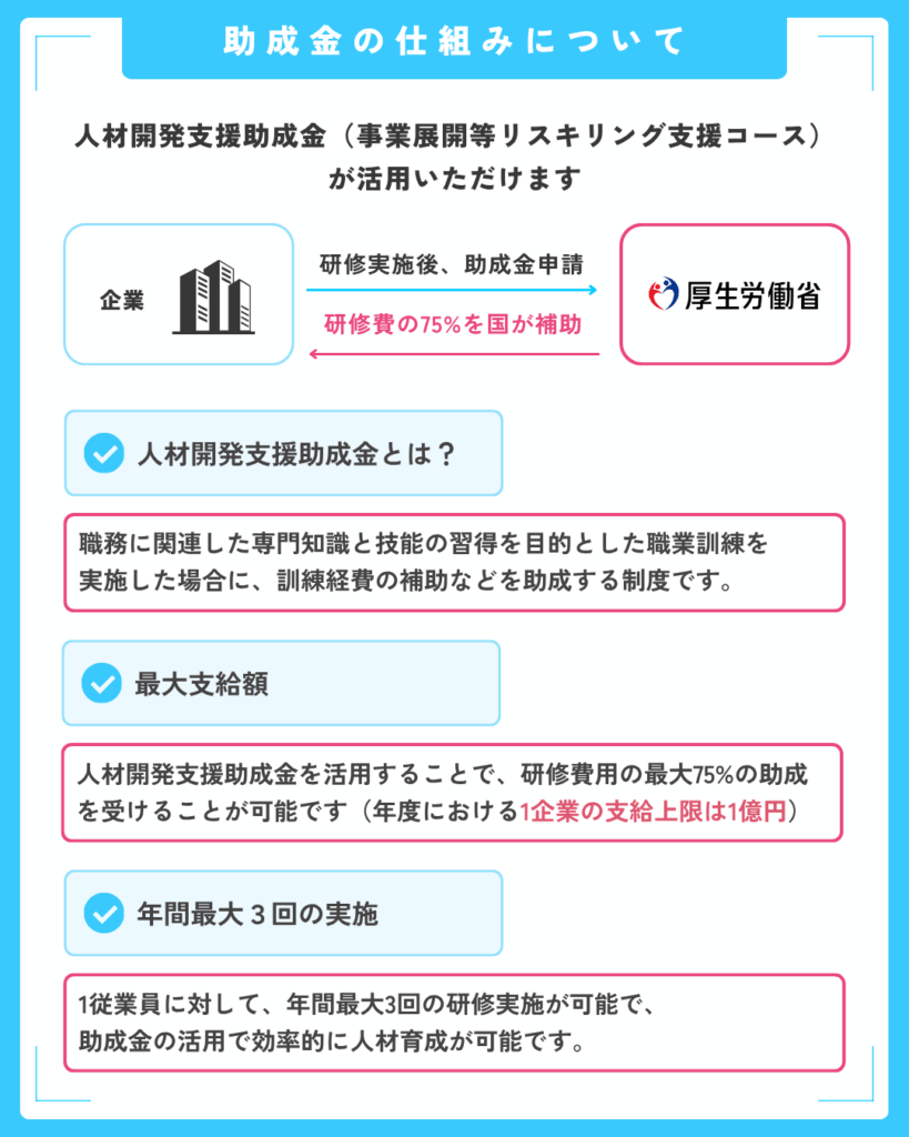 ご活用いただくことで、研修費用の最大75%を国が補助。