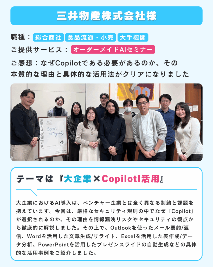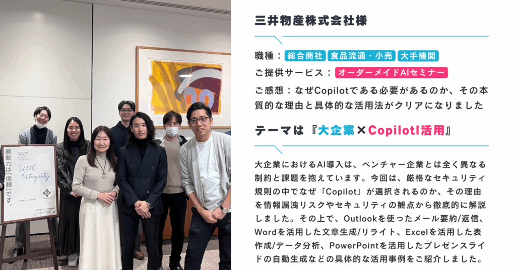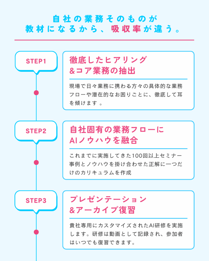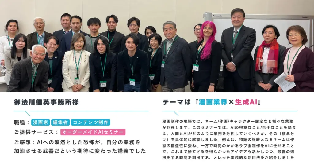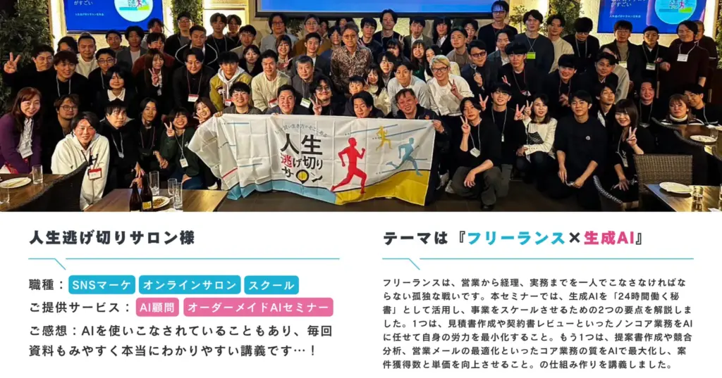 日進月歩の生成AI業界では、過去に作成した完成品を提供するだけの汎用なセミナーでは、