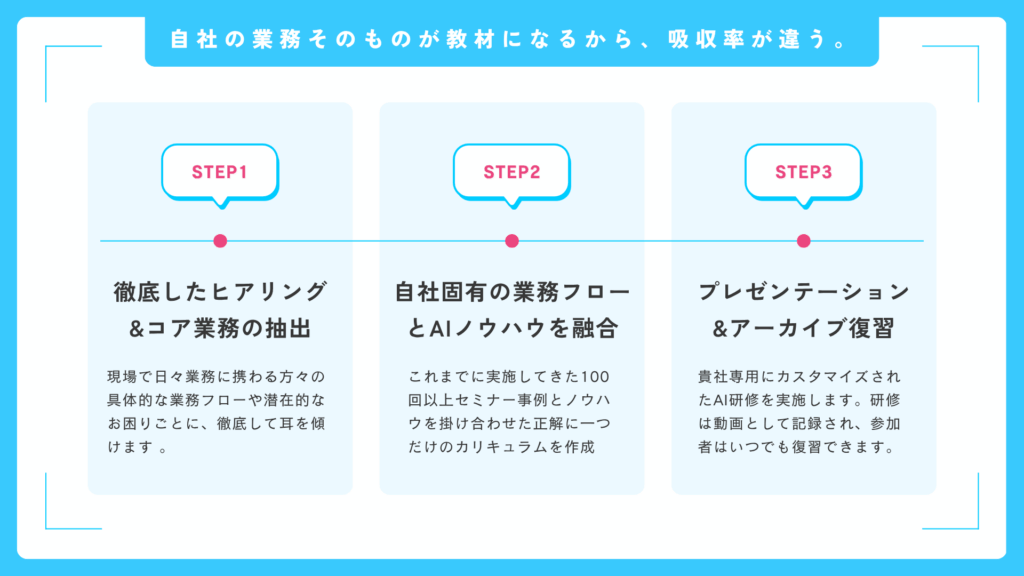 数々のAI導入を成功させてきた専門家が、貴社の業務特性や課題を徹底分析。 無駄な試行錯誤をせず、短期間で最大の効果を発揮できるセミナーを計画・開催します。