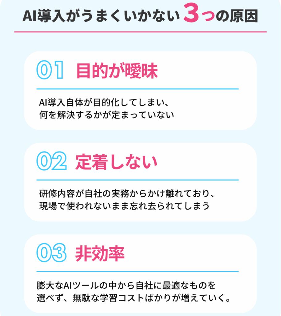 トレンドに振り回されることなく、貴社の課題解決に必要なAI知識だけを厳選してお伝えします。 無駄な学習時間を徹底的に削減し、効率的なスキルアップを実現します。