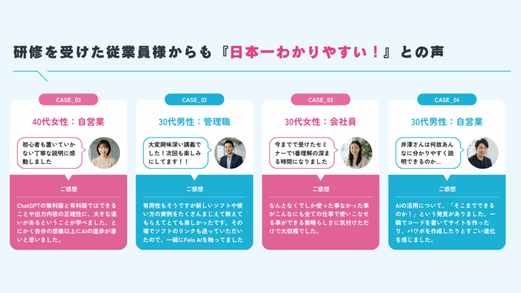 苦手意識を持つ方にも「これなら私にもできそう!」と感じてもらえるAI教育を追求します。