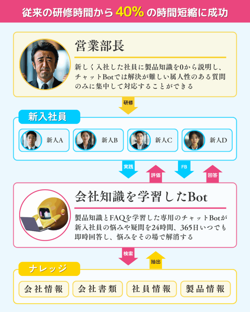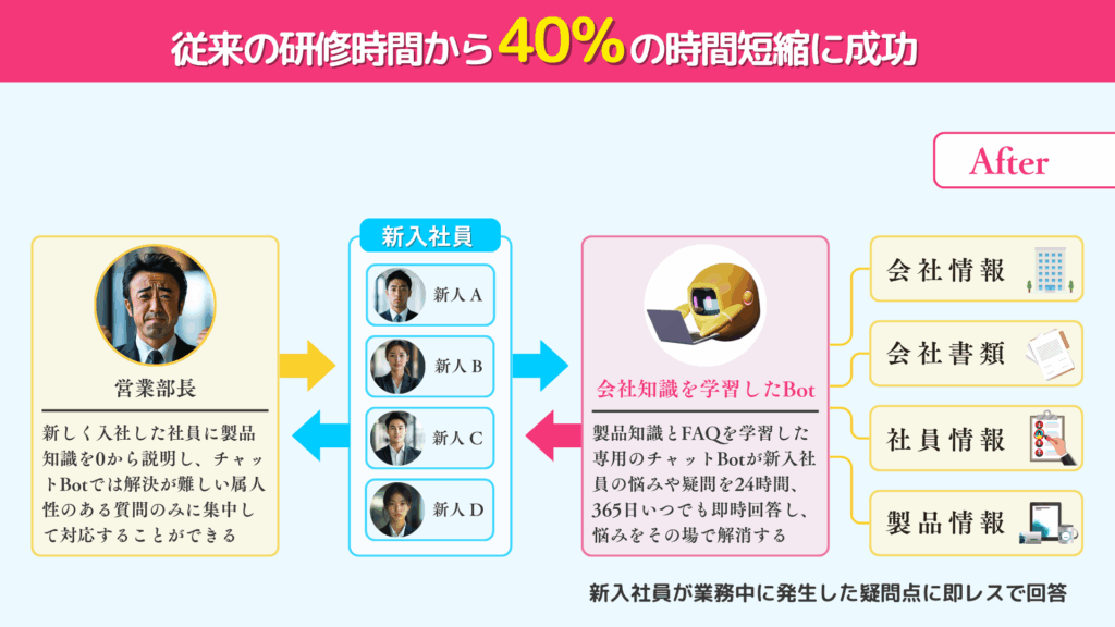 そこで弊社では、製品や会社情報、これまでのQ&Aを学習させたチャットBotを導入。 新入社員が業務中に発生した疑問点やFAQに対し、その場で製品や会社の情報にすぐにアクセスできるため、短期間での成長を実現。研修中でも、退勤後でも、各自が必要に応じて製品情報にアクセスできるため、分からない点を即座に解決できる環境が実現し、従来の研修時間も、40%の時間短縮に成功しています。