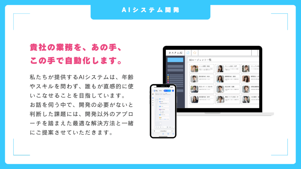 はい、可能です。まずは業務の一部を自動化する小さなAIツールから開発し、効果を実感いただいた上で、段階的に適用範囲を拡大していくアプローチを推奨しております。リスクを最小限に抑えながら、着実なAI導入をご支援します。