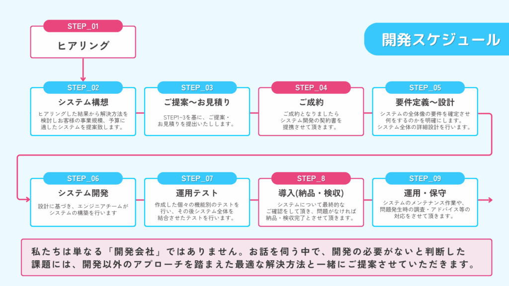 開発以外のアプローチを踏まえた最適な解決方法と一緒にご提案させていただきます。