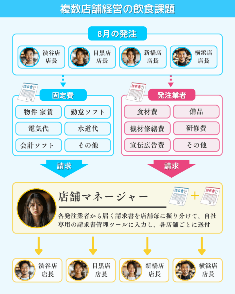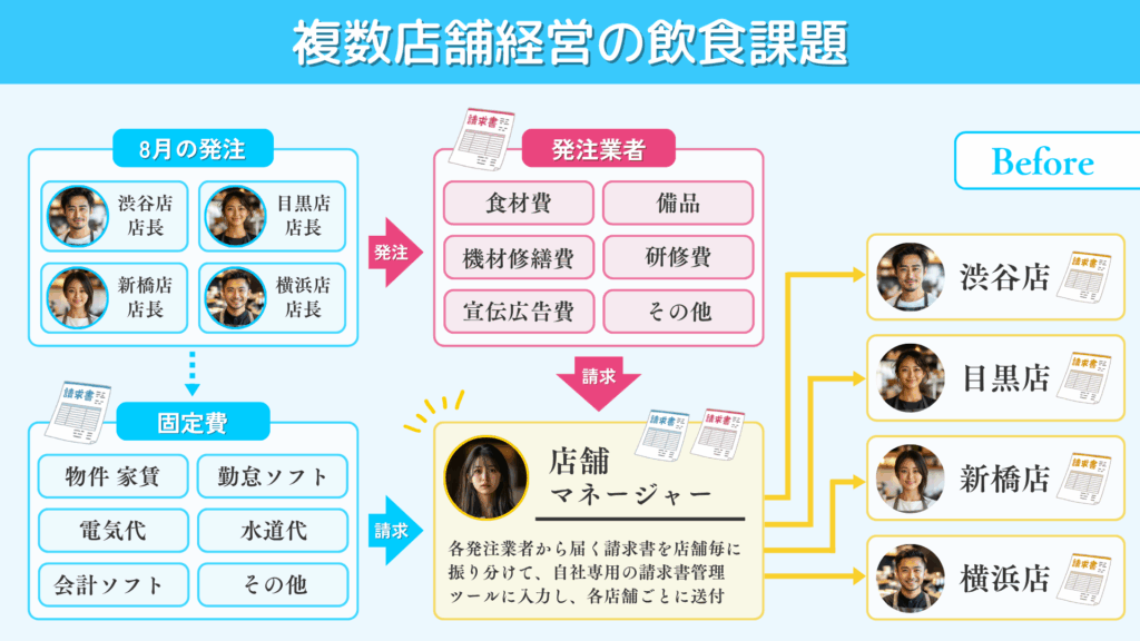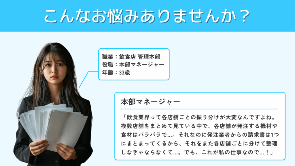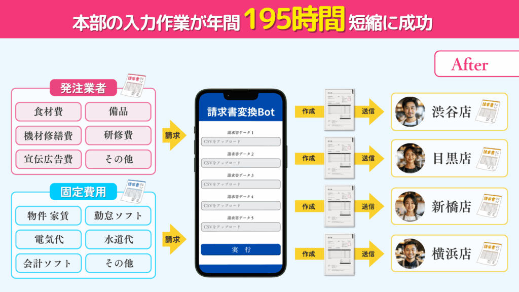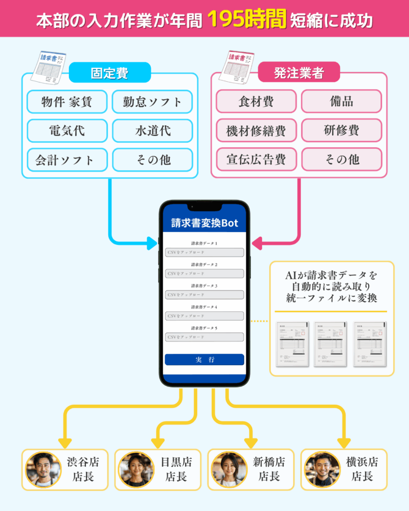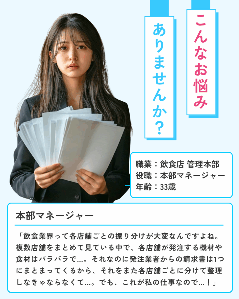 FC事業の本部統括を行う中で、商品の発注元ごとに異なるフォーマットで送られてくる請求書を、各FC店毎、1つの請求書にまとめるために、毎月担当従業員が社内の専用書式ファイルに転記している。
