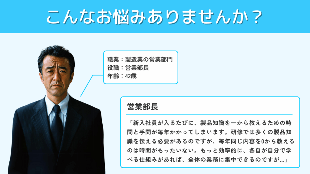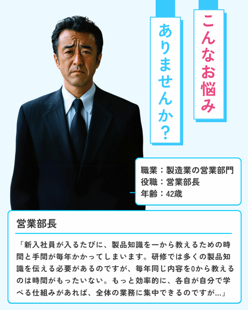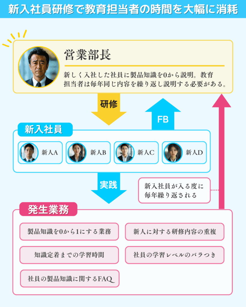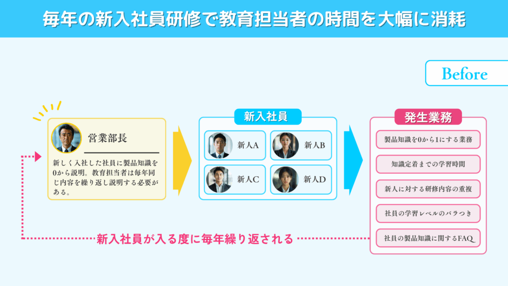 毎年の新入社員研修で製品知識を0から1にする業務が発生する中教育担当者の時間を大幅に消耗している。