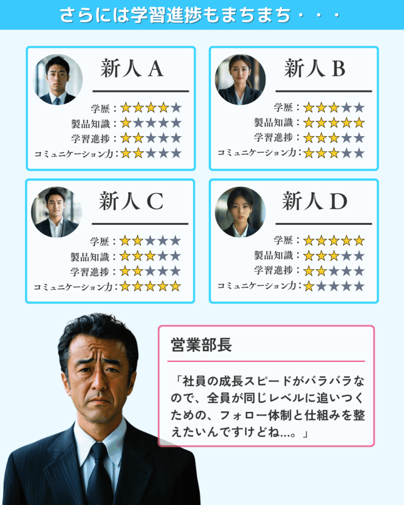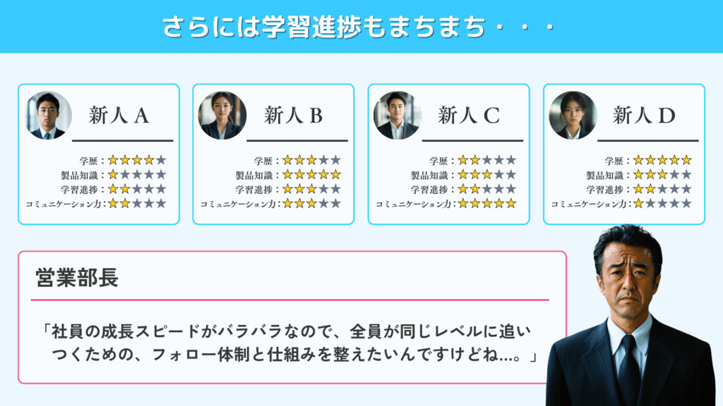 研修では多くの製品知識を伝える必要がありますが、毎年同じ内容を0から教えるには時間がかかりすぎます。もっと効率的に、各自が自分で学べる仕組みがあれば、全体の業務に集中できるはずです。