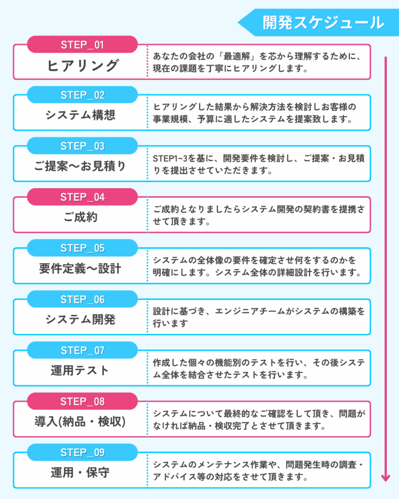 開発するシステムの規模や要件によって個別にお見積もりいたします。