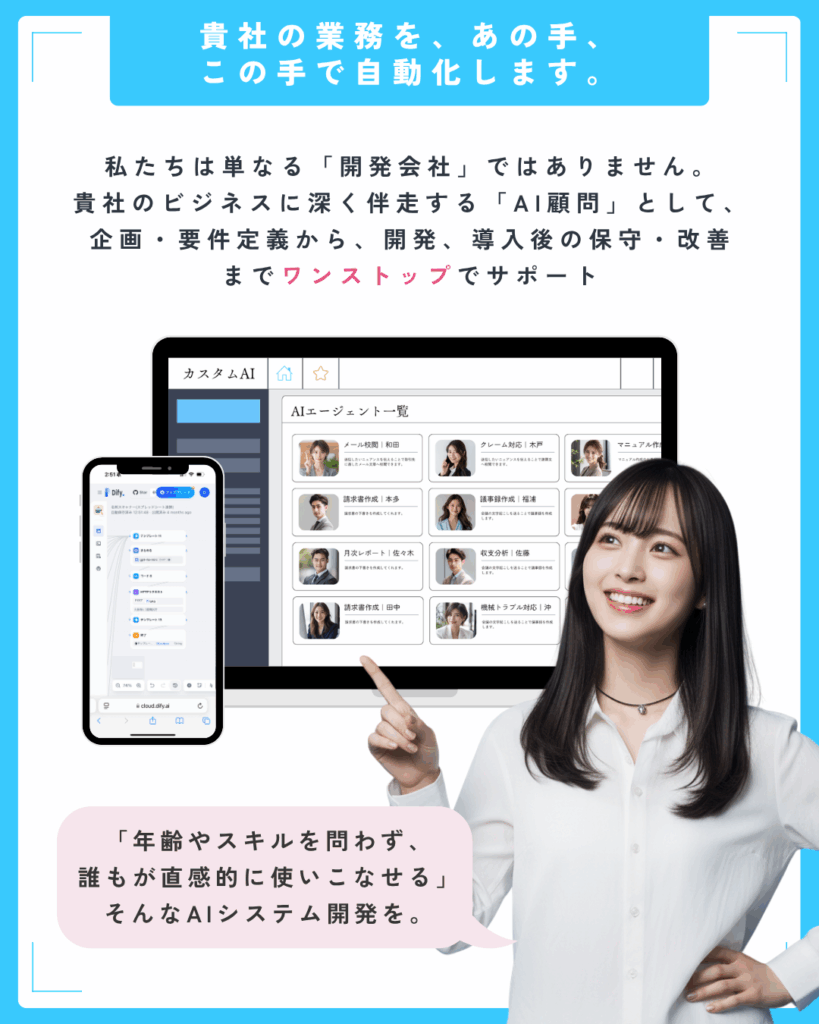 私たちは単なる「開発会社」ではありません。貴社のビジネスに深く伴走する「AI顧問」として、