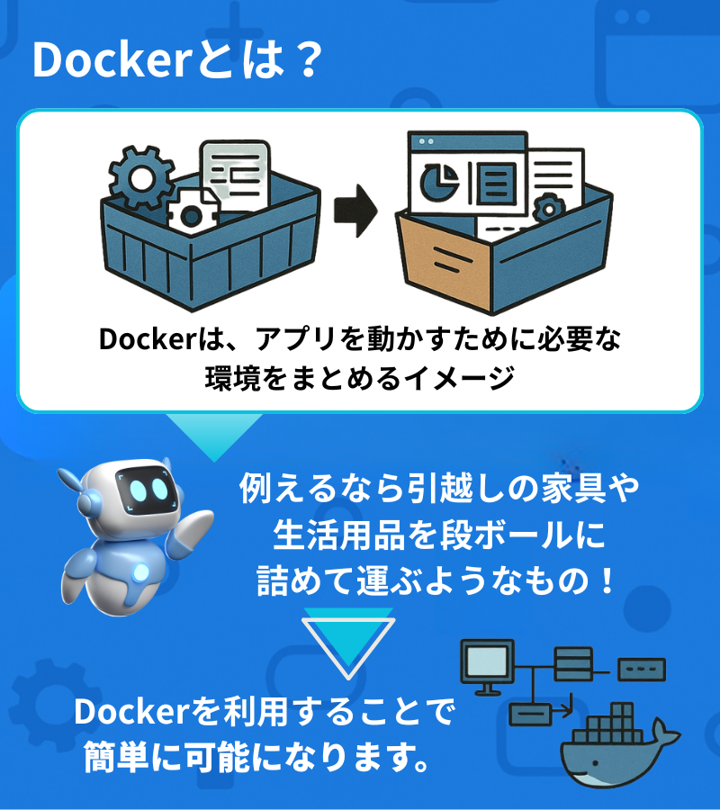 Dockerは、アプリを動かすために必要な環境をまるごと1つの“箱”にまとめるようなイメージのツールです。