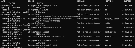 このコマンドを実行することで、必要なファイルを読み込み、Difyに必要なサービス(APIやWeb画面、データベースなど)をすべて一度に起動することができます。