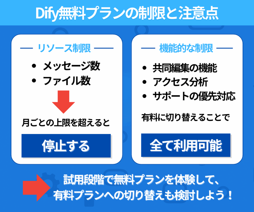 なお、制限の内容は変更される場合があるため、Difyの公式サイトで最新情報を定期的に確認する必要があります。
