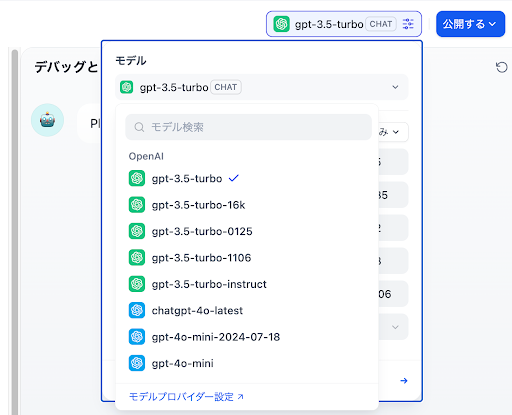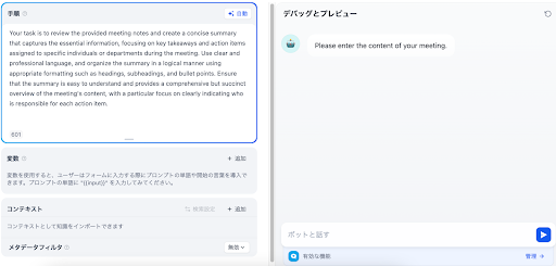 設定が完了したら、デバッグとプレビュー画面でチャットボットの動作をテストします。